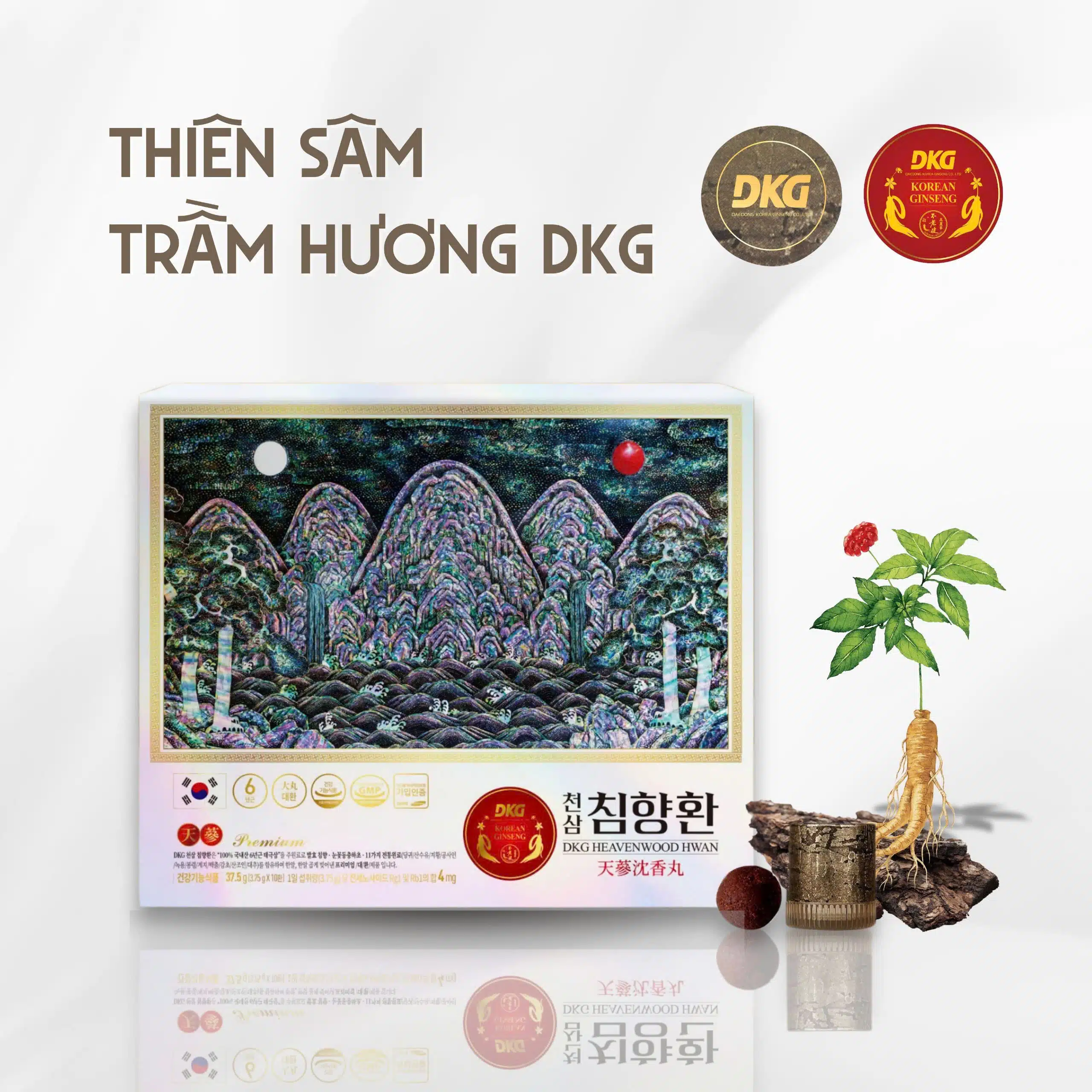 - Viên Thiên Sâm Trầm Hương DKG Heavenwood Hwan là sản phẩm được cấp phép lưu hành tại Việt Nam. Có tem chống hàng giả, tem bóng phía trước hộp.