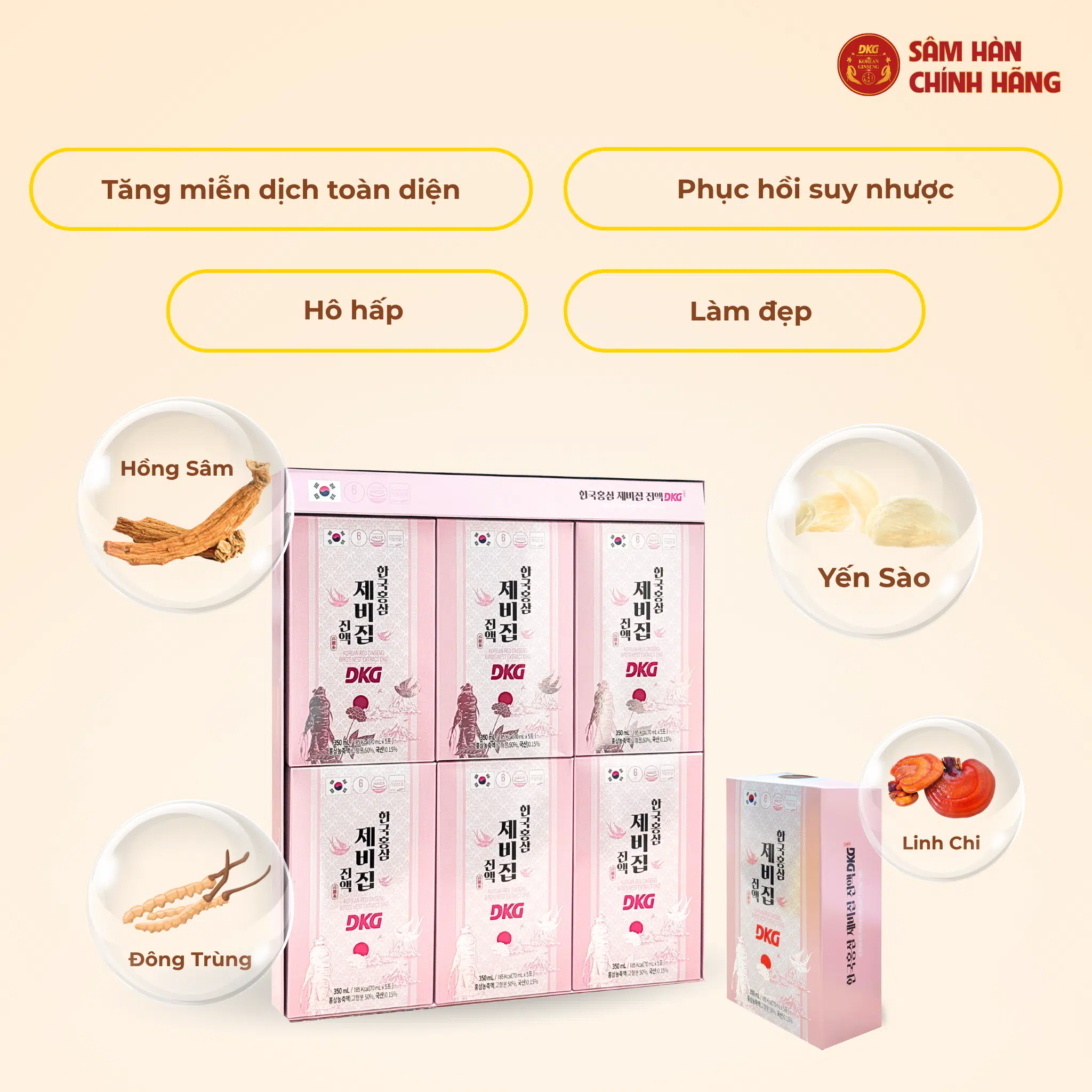 Yến sào hồng sâm DKG là sản phẩm kết hợp giữa hồng sâm Hàn Quốc 6 năm tuổi và yến sào cao cấp, mang lại nhiều lợi ích cho sức khỏe. Dưới đây là thông tin chi tiết về công dụng của sản phẩm: