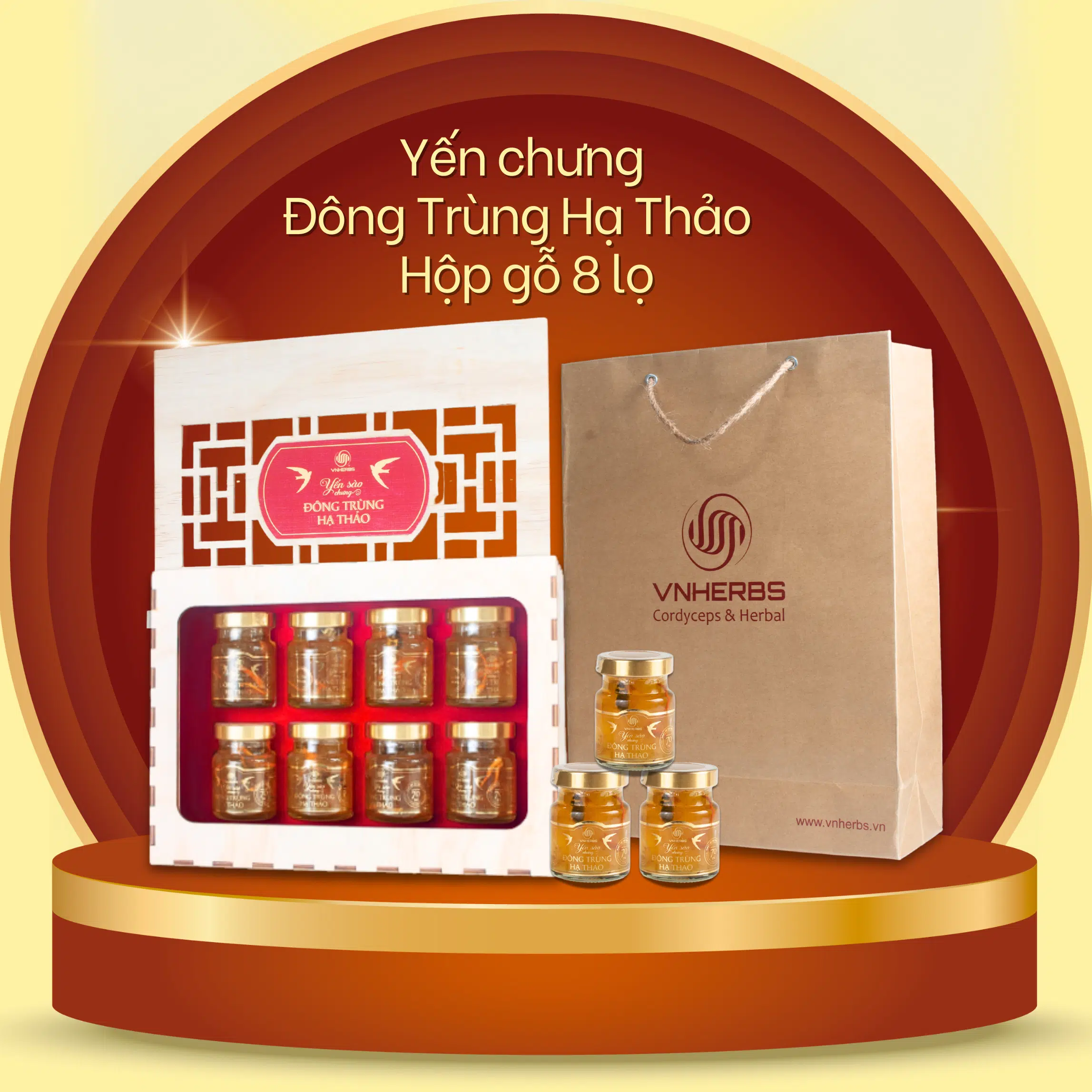 - Yến chưng Đông trùng hạ thảo Sinh khối: 10 gram sợi yến tươi, 1 gram Đông Trùng Hạ Thảo Ký Chủ Nhộng sấy thăng hoa, đường kiêng, nước vừa đủ lọ 70ml